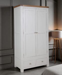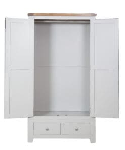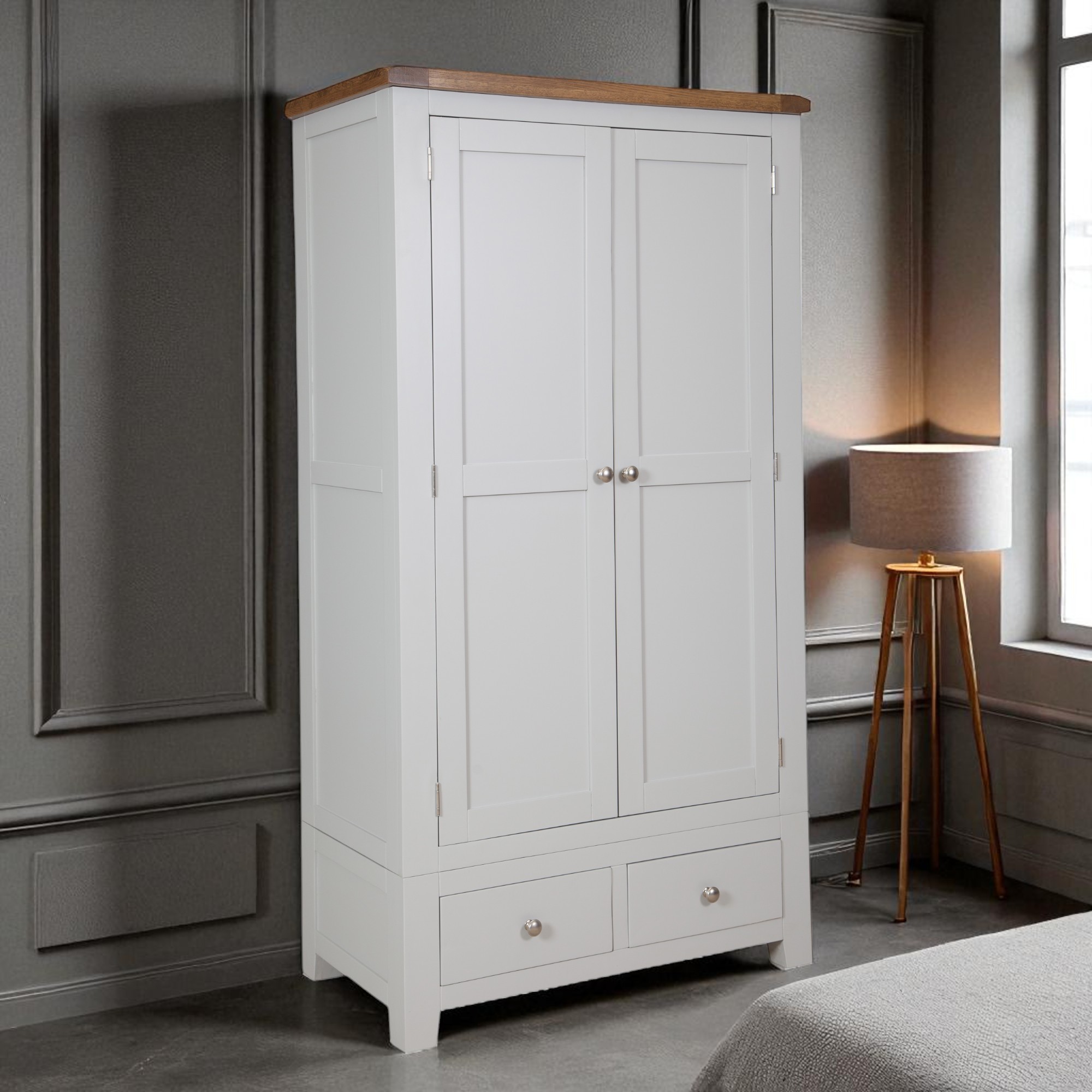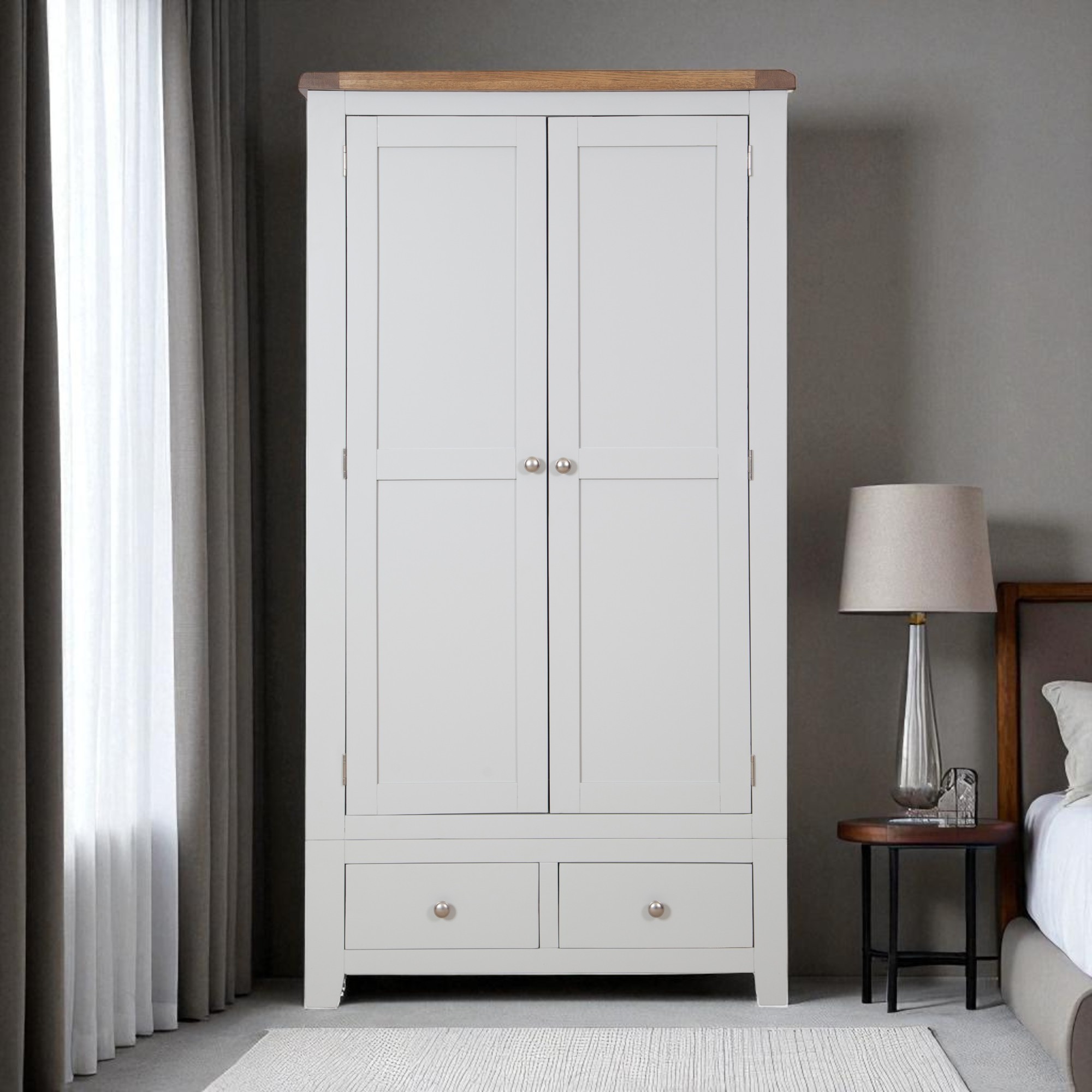 Made from a combination of solid oak, solid pine and oak veneered panels this range is beautifully finished in painted French grey with silver knob handles.