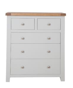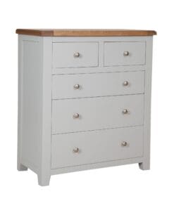 Made from a combination of solid oak, solid pine and oak veneered panels this range is beautifully finished in painted French grey with silver knob handles.