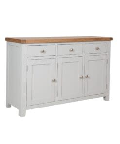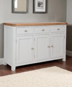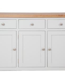 Made from a combination of solid oak, solid pine and oak veneered panels this range is beautifully finished in painted French grey with silver knob handles.